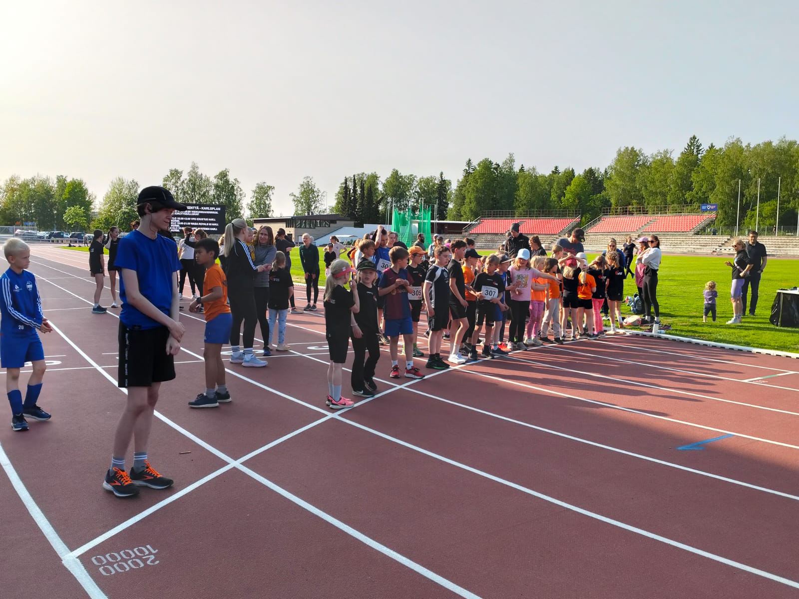 * Juoksujen veryttely tai verryttelykentälllä tai takasuoralla; kisasuoralle pääsy ikäluokittain (n.5 min ennen omaa starttia)